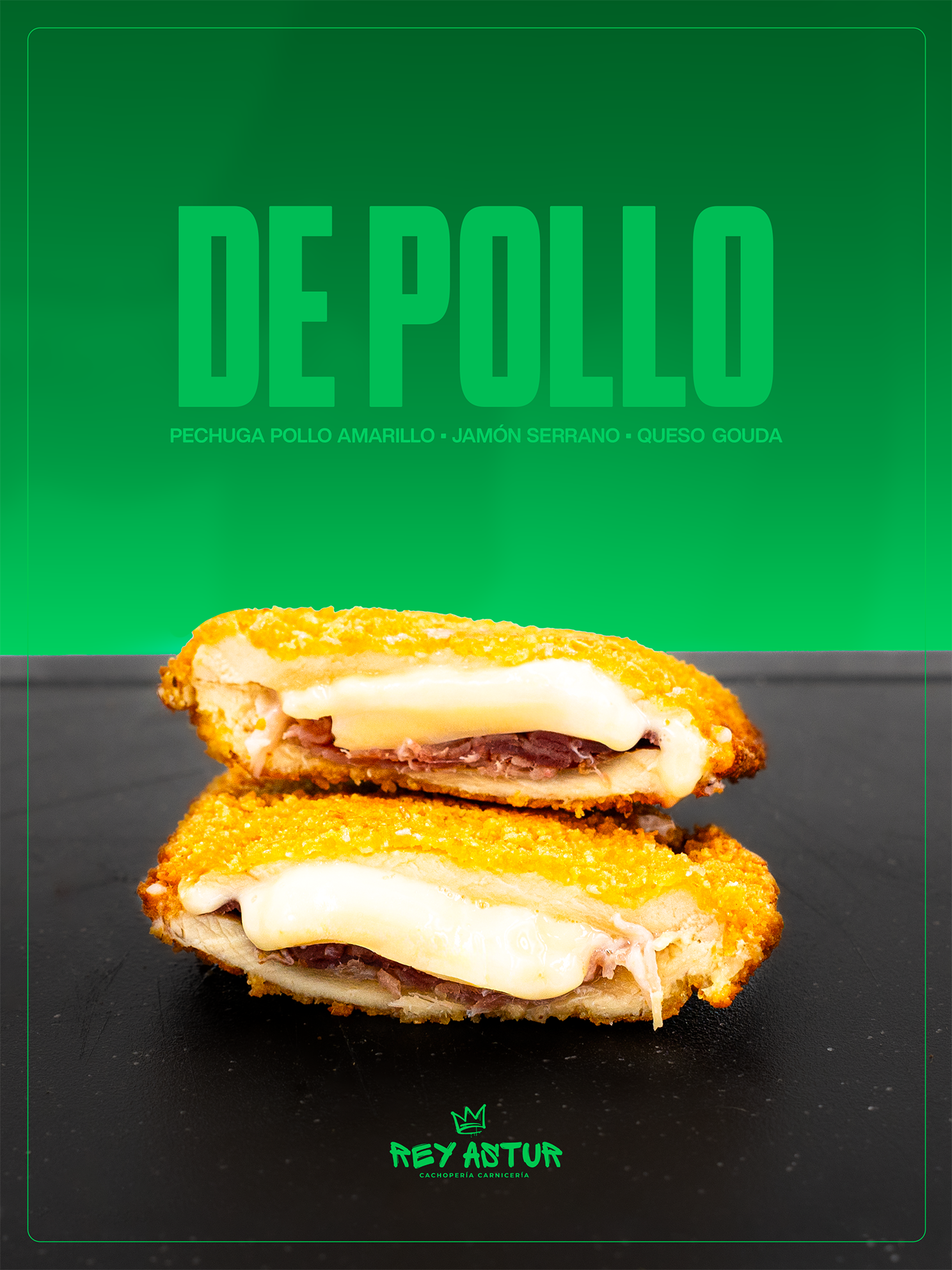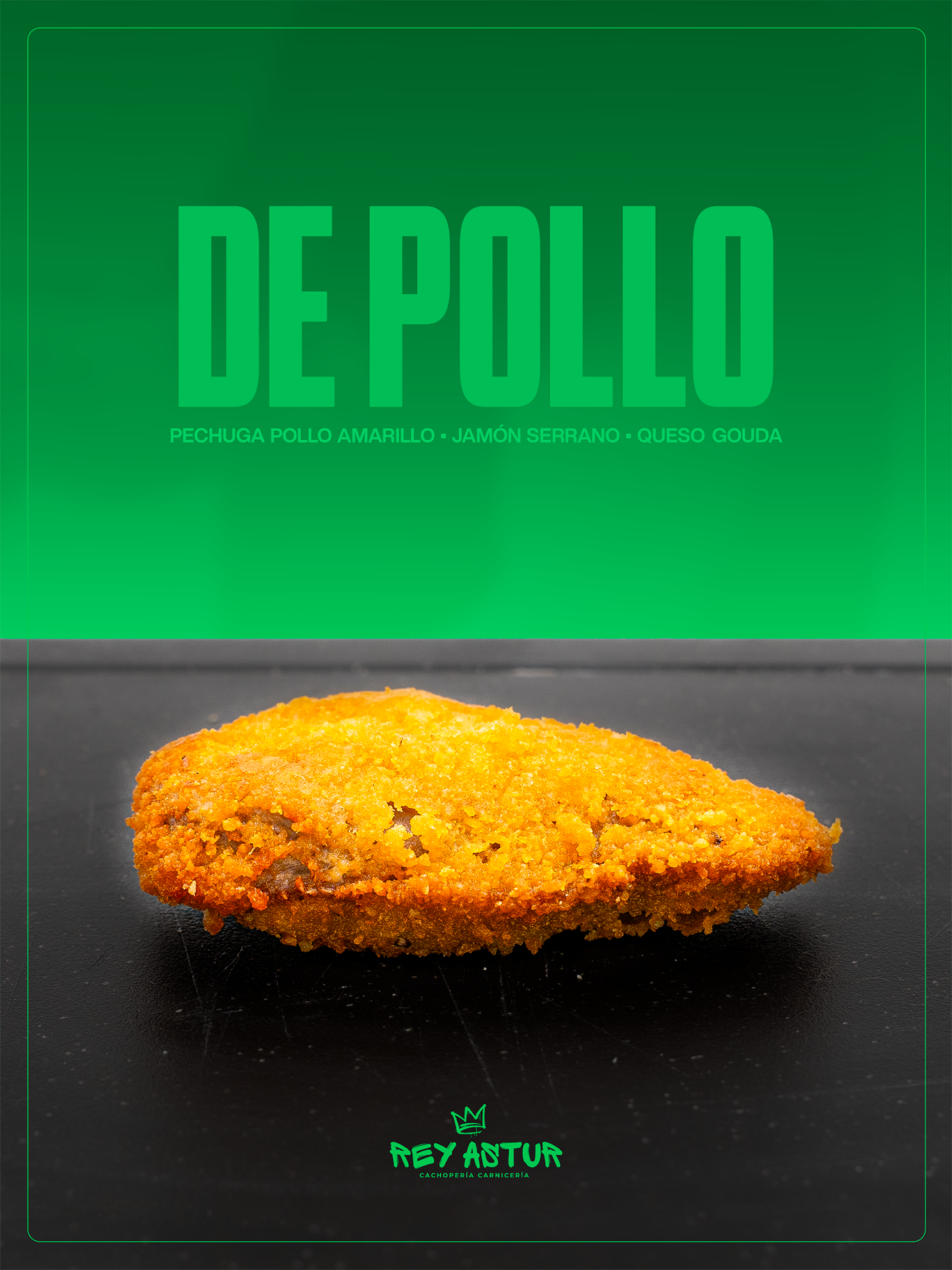 El de Pollo es un cachopo pensado para disfrutar sin excesos, pero sin renunciar al sabor. Las pechugas de pollo amarillo, tiernas y jugosas, aportan una base limpia y suave que hace el bocado ágil y fácil, ideal para quienes buscan un cachopo más ligero pero igualmente satisfactorio.