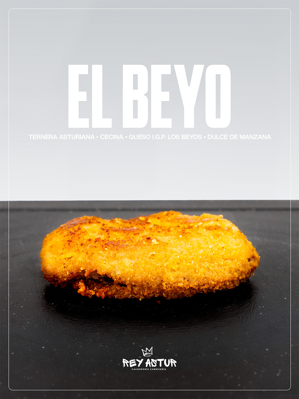 El Beyo es un cachopo que se construye desde la raíz, pensando en el producto y en cómo dialogan los sabores cuando se respetan los tiempos y los orígenes. La Ternera Asturiana, firme y jugosa, actúa como base de un relleno donde cada ingrediente aporta identidad propia: la cecina de Astorga, intensa y ligeramente ahumada; el queso I.G.P. Los Beyos, con carácter, fundente y profundamente ligado al territorio; y un toque de dulce de manzana que aparece al final para suavizar y redondear el conjunto.