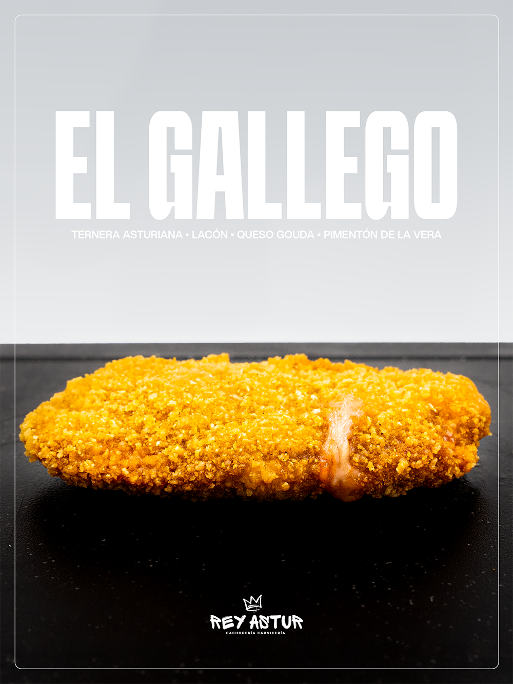 El Gallego es un cachopo que apuesta por la contundencia serena, esa que nace de recetas sencillas bien ejecutadas. La Ternera Asturiana, firme y jugosa, envuelve un relleno donde cada ingrediente cumple su función con claridad: el lacón cocido aporta suavidad y una textura melosa; el queso Gouda se funde envolviendo el conjunto con cremosidad; y el pimentón de la Vera introduce un matiz aromático y ahumado que define el carácter del plato.